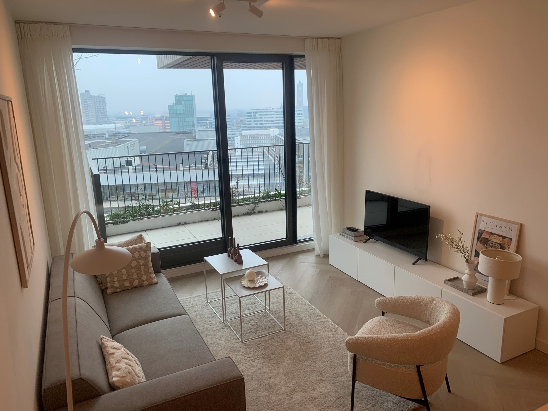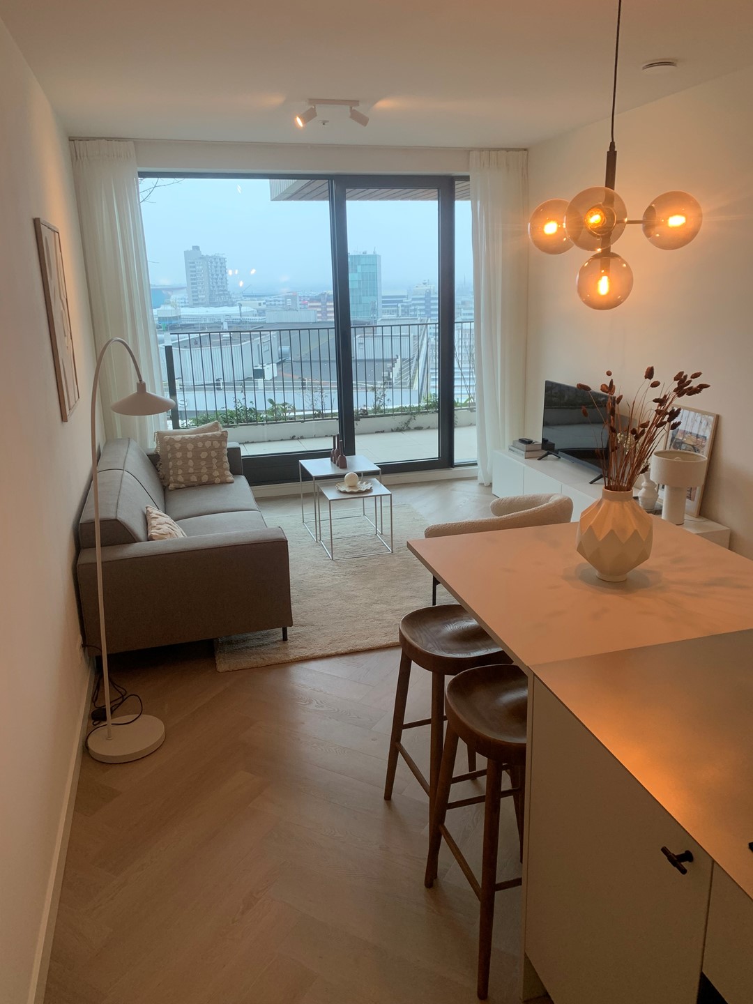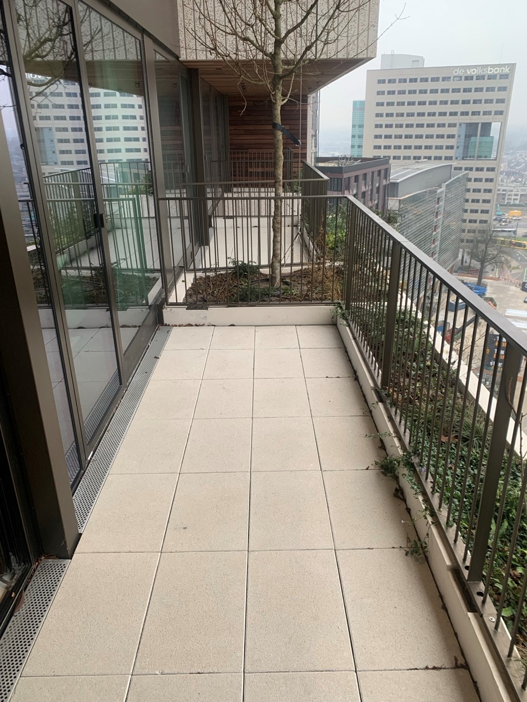 This 2-room apartment is located on the 14th floor. With 64m² of living space, an external storage room (approx. 5m²) and a lovely spacious balcony (approx. 10m²), this apartment offers maximum living comfort. You enter the apartment through the spacious hall that provides access to all areas. From the living room you have access to the balcony through the sliding doors with beautiful views. The luxurious open kitchen is equipped with all desired built-in appliances, namely: extractor hood, 4-burner induction hob, fridge-freezer, combination microwave and dishwasher. The spacious bedroom (approx. 16m²) has built-in wardrobe space and also provides access to the balcony. The bathroom has a spacious walk-in shower, sink including washbasin furniture, bathroom mirror with lighting and towel radiator. The toilet has a sink and is separate. The spacious technical room is equipped with a washing machine and dryer and also offers sufficient storage space. Finally, there is an external storage room (approx. 5m²) in the corridor/hall of the 4th floor, equipped with electricity.