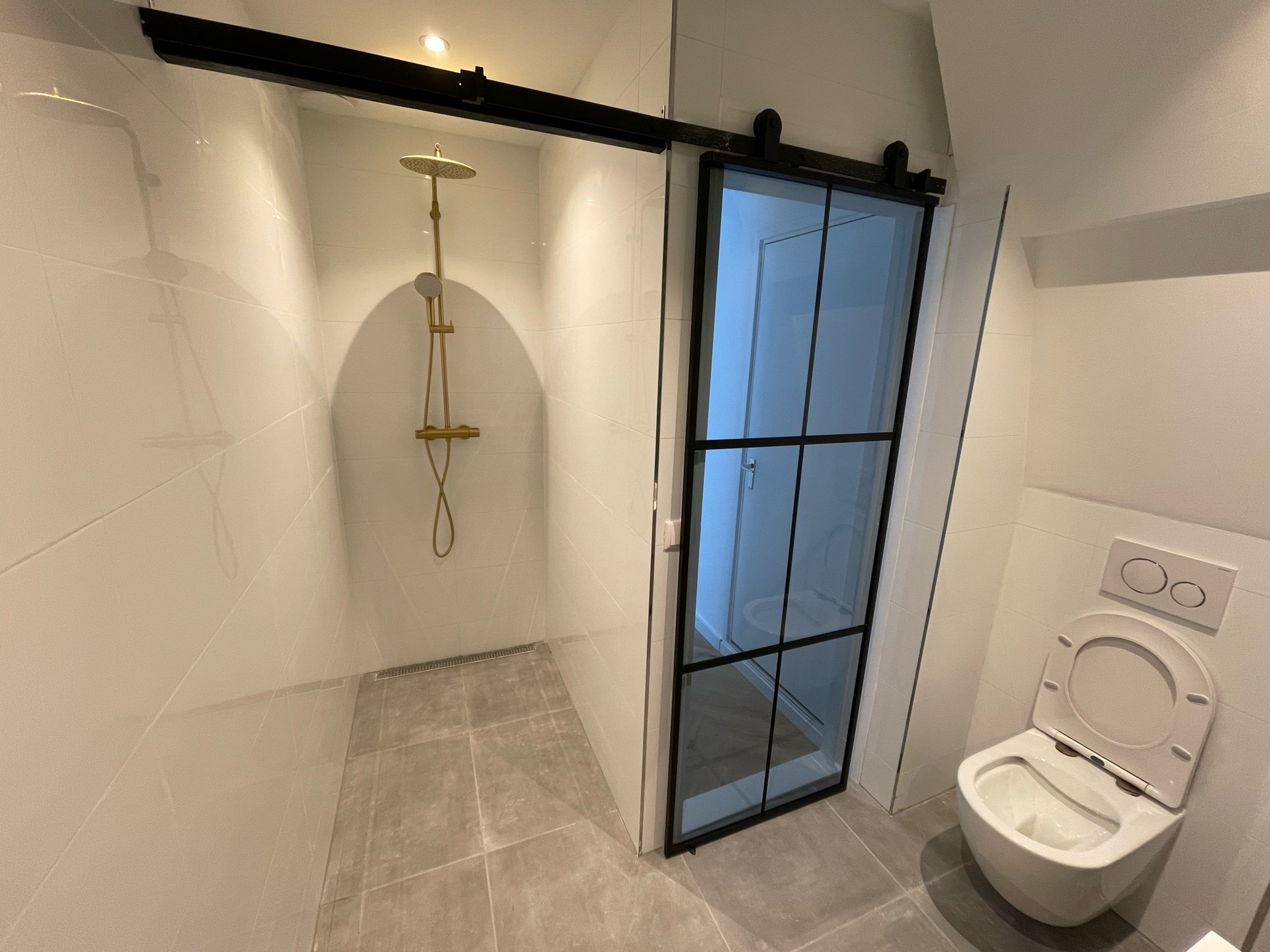 • Moderne badkamer voorzien van ruime inloopdouche, wastafel inclusief wastafelmeubel en toilet.